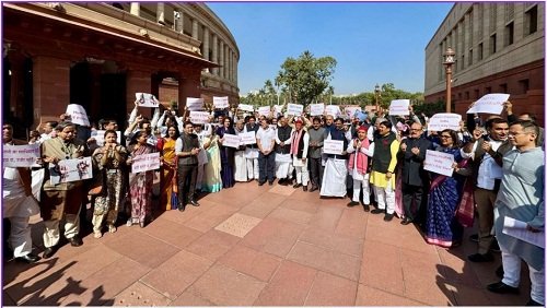 विपक्षी सांसदों ने संसद भवन परिसर में विरोध प्रदर्शन किया