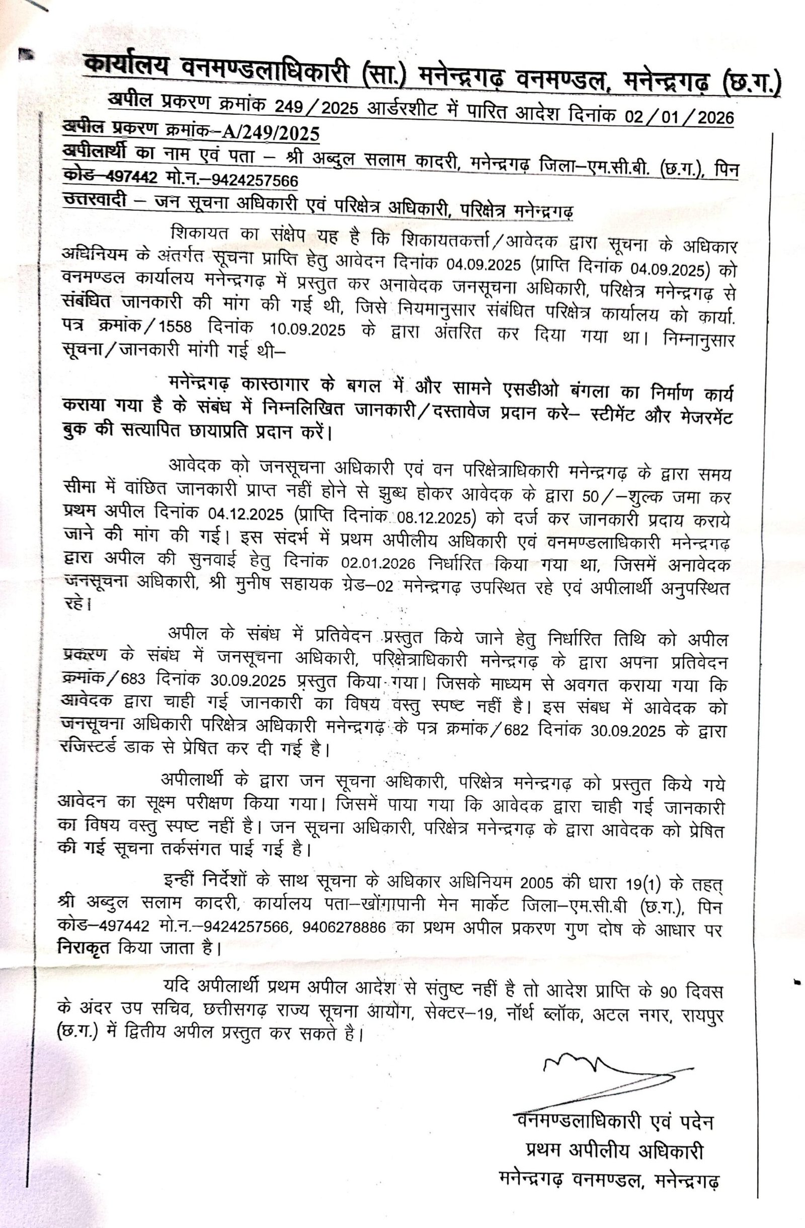 अब्दुल सलाम क़ादरी। मनेन्द्रगढ़ (छ.ग.) — सूचना का अधिकार अधिनियम, 2005 (RTI Act) को कमजोर करने और तथ्यों को दबाने के गंभीर आरोपों के बीच मनेन्द्रगढ़ वनमण्डल एक बार फिर विवादों के घेरे में है। ताज़ा मामला आरटीआई आवेदन क्रमांक A/249/2025 से जुड़ा है, जिसमें कार्यालय वनमण्डलाधिकारी (सा.), मनेन्द्रगढ़ द्वारा 02.01.2026 को पारित आदेश ने प्रशासनिक पारदर्शिता पर ही सवाल खड़े कर दिए हैं।